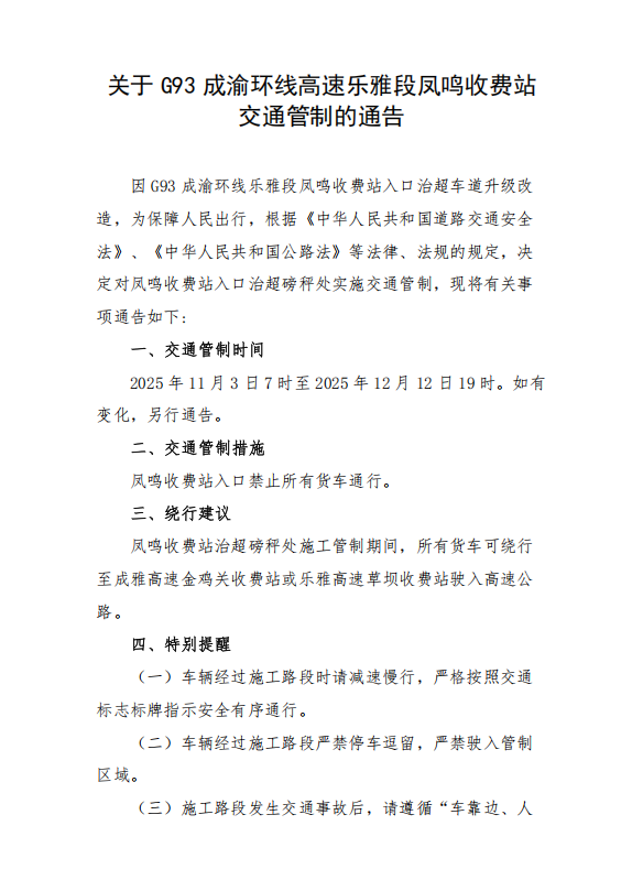 因G93成渝环线乐雅段凤鸣收费站入口治超车道升级改造,为保障人民出行,根据《中华人民共和国道路交通安全法》、《中华人民共和国公路法》等法律、法规的规定,决定对凤鸣收费站入口治超磅秤处实施交通管制,现将有关事项通告如下: