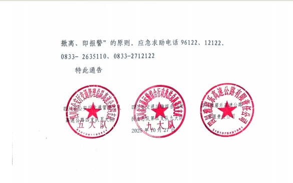 (三)施工路段发生交通事故后,请遵循“车靠边、人撤离、即报警”的原则。应急求助电话96122、12122、0833- 2635110、0833-2712122