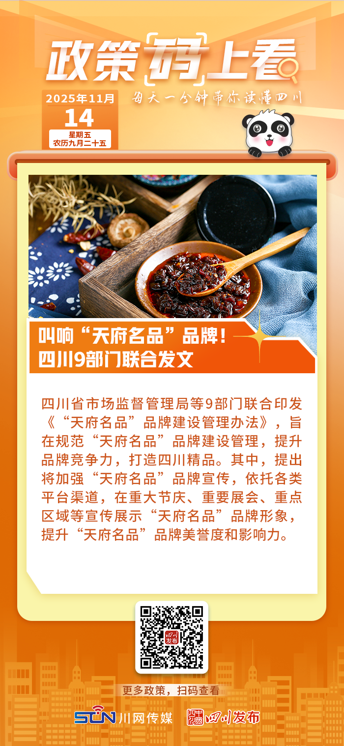 四川发布客户端消息 为规范“天府名品”品牌建设管理,提升品牌竞争力,打造四川精品,日前,四川省市场监督管理局等9部门联合印发《“天府名品”品牌建设管理办法》(以下简称《办法》),自2025年12月1日起实施,有效期5年。