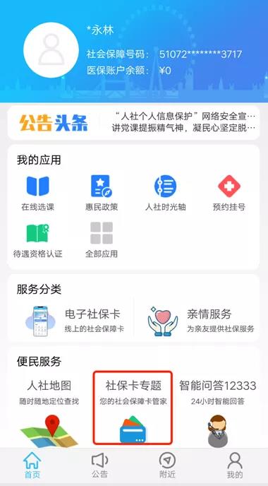 步骤1、登录“绵阳智慧人社APP”,在【首页】->【便民服务】中选择【社保卡专题】,进入社保卡专题界面。