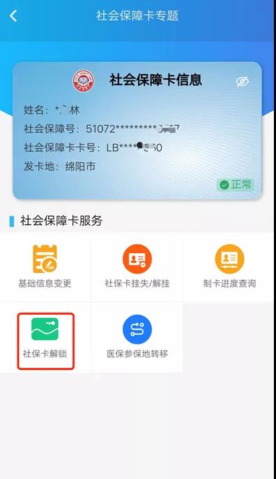 现在,造成社保卡锁卡后,可登录“绵阳智慧人社APP”,进行实名认证解锁申请,获取解锁二维码,定点医药机构窗口工作人员就可以依据解锁二维码在信息系统中对社保卡进行解锁重置密码操作。