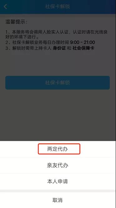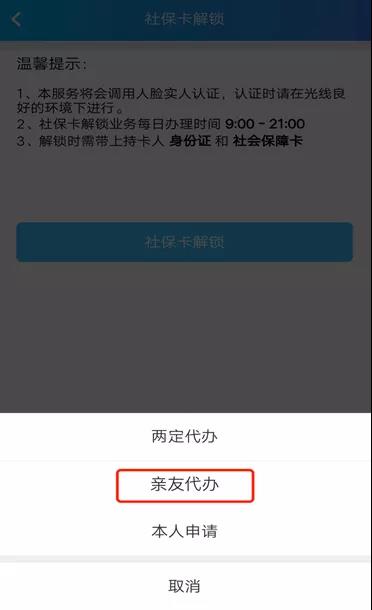 步骤2、选择【社保卡专题】页面中的【社保卡解锁】功能,支持“本人申请”、“亲友代办”和“两定代办”三种方式: