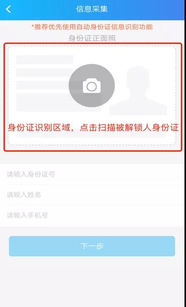 2为亲友办理社保卡解锁业务时,可以选择“亲友代办”的方式。点击“亲友代办”,在信息采集界面,点击中间身份证识别区域,扫描被解锁人的身份证进行自动识别(也可以手动输入被解锁人的身份证号码及姓名),识别或输入身份证信息后,输入被解锁人的手机号,以便在业务办理成功时,接收短信通知。