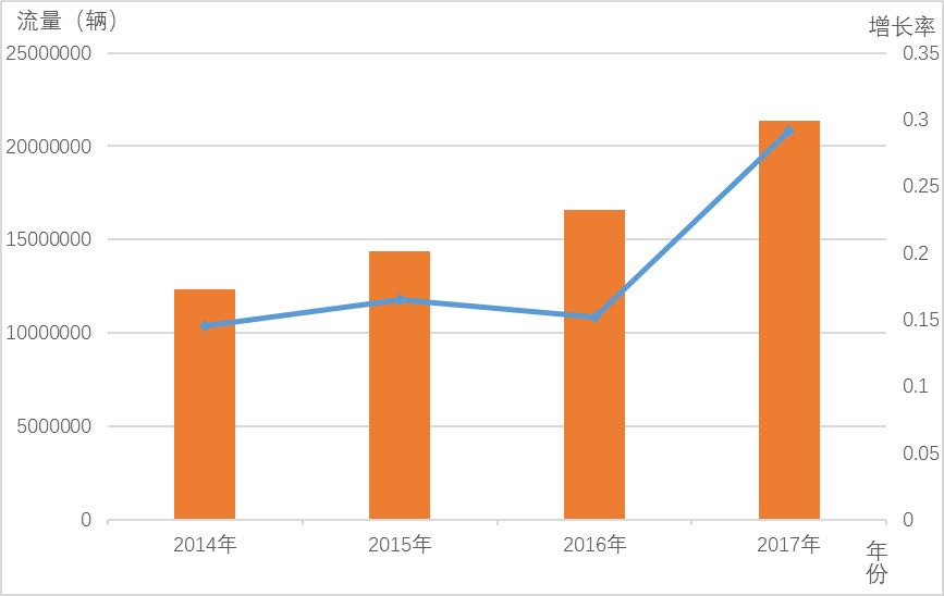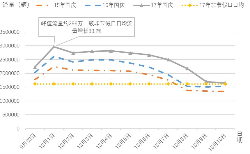 这一数据主要根据近三年数据趋势分析得出。2014年、2015年、2016年国庆假期,四川省高速公路网出口总流量分别为约1255万辆、1444万辆、1671万辆,日均值和最高值连续三年呈15%左右的增长。