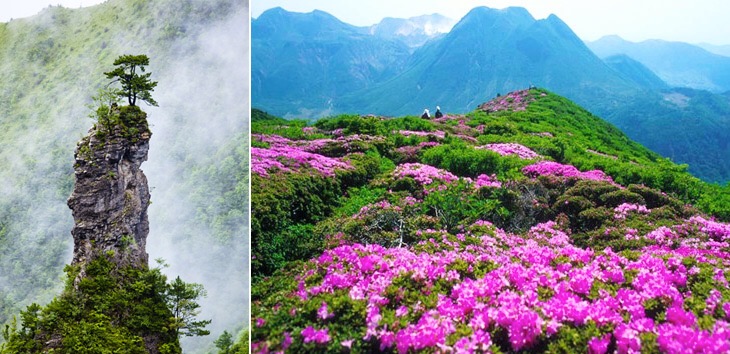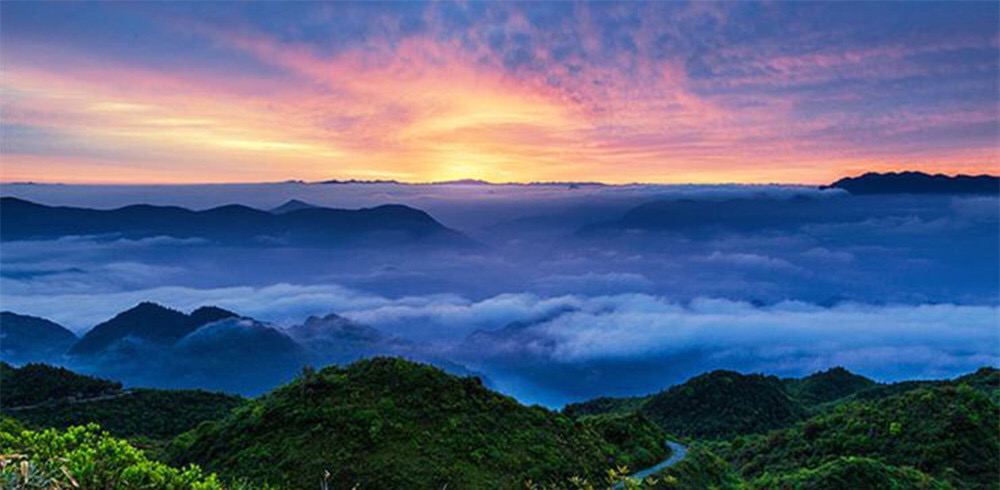 山顶4万多亩的木竹林随山风摇摆,万顷竹海轻波悠悠,生机勃勃,令人流连忘返;垭口以东,春末夏初,百余亩粉红杜鹃花林与竹海相辉映,形成“万绿丛中一片红”的迷人景象。