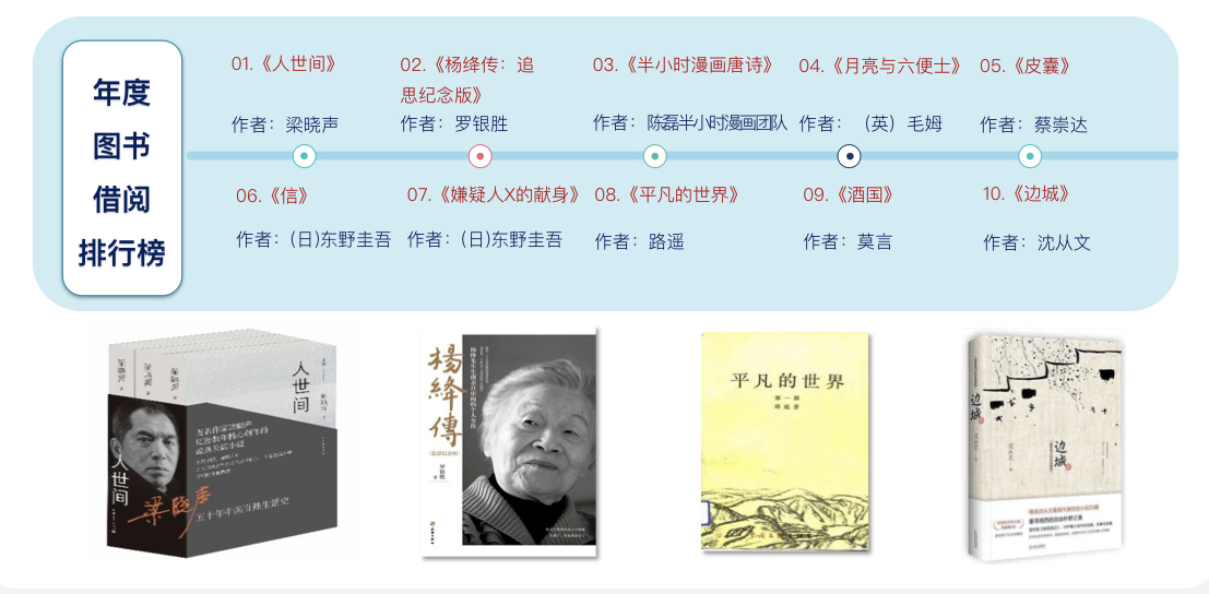 另外,记者通过梳理《报告》发现,在四川省图书馆的注册读者中,年龄最大的94岁,最小的2岁,读者群体覆盖了全年龄段。有趣的是,各个年龄段喜爱的书籍各有特色。2023年,91岁的所先生借阅21册书目,他注重养生,曾借阅了《家庭中医养生图册》《中医养生81讲:音频版》《常用中药养生图册》等书籍。2岁的肖姓小朋友则借阅了《我会自己吃饭》《宝宝启蒙触摸发声书·动物园》《猜猜我吃了什么:中英双语》等7本儿童启蒙读物。另外,根据四川省图书馆的统计数据,《人世间》《杨绛传:追思纪念版》《半小时漫画唐诗》《月亮与六便士》《皮囊》位列年度图书借阅排行前五位。