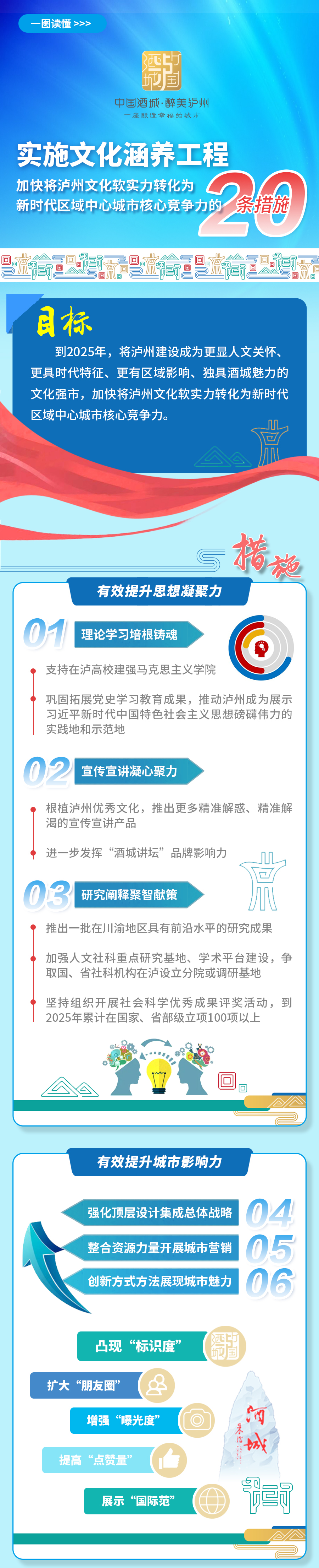 泸州将通过理论学习、宣传宣讲、强化文化遗产传承发展、推进文旅融合创新等20条措施,加快将泸州文化软实力转化为新时代区域中心城市核心竞争力,有效提升泸州城市思想凝聚力、城市影响力、文化感染力、文明感召力、舆论传播力、工作聚合力。