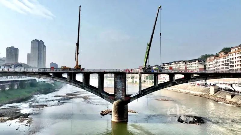 10月26日,合江县九支镇,横跨赤水河与九支镇相连的赤水河大桥上,桥面打孔、块件拆除等维修处治工程正在有序推进。