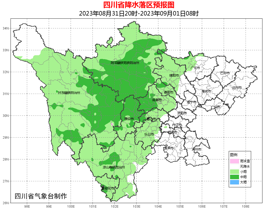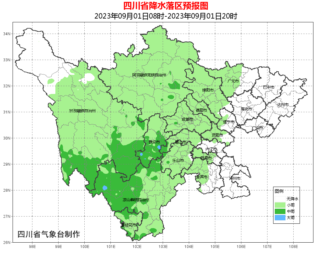 绵阳、德阳、成都、雅安、眉山、乐山6市和广元西部多云间阴有分散阵雨或雷雨,局部中雨,盆地其余地方多云间晴;川西高原和攀西地区阴天间多云有小到中雨。