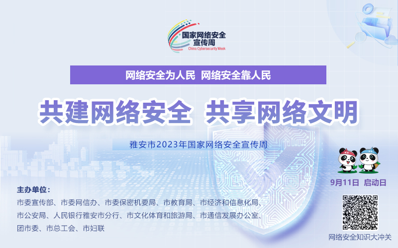 今年的网络安全宣传周以“网络安全为人民,网络安全靠人民”为主题,于9月11日至17日在全市范围内统一开展,“雅安市网络安全知识大冲关──2023年国家网络安全宣传周知识竞赛”等多项活动同步上线。
