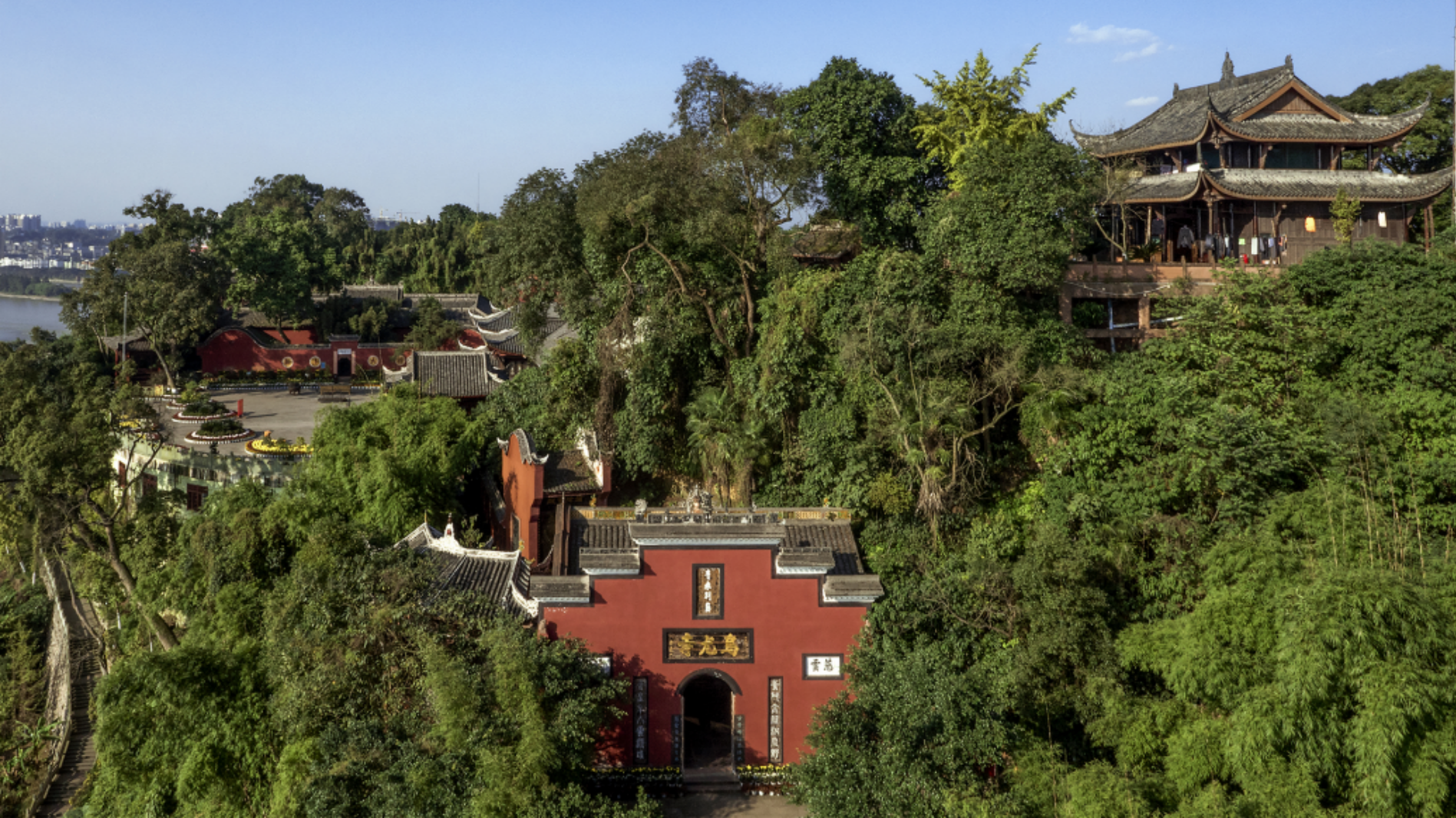 离堆,即乌尤山,位于乐山市城东1.5千米的岷江东岸,四面环水,与凌云山相对。山上竹树茂盛,现存有崖墓、古建筑及摩崖石刻题记等文物古迹,是乐山大佛遗产地的重要组成部分。