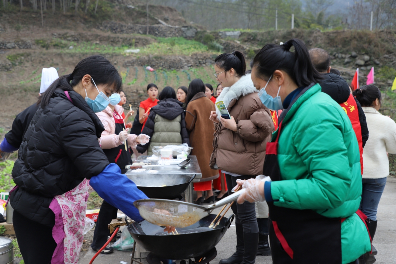 官料河休闲步道一侧,微风轻拂,油菜花卷起层层金色波浪与河面上泛起的微波、周围的山峦交相辉映,构成了一副如诗如画的田园美景。在活动现场美食品鉴区,新鲜出锅的炸洋芋、手工豆花、炸酥肉、三角粑、南瓜饼、一道道美味“嘉”肴让游客流连忘返。