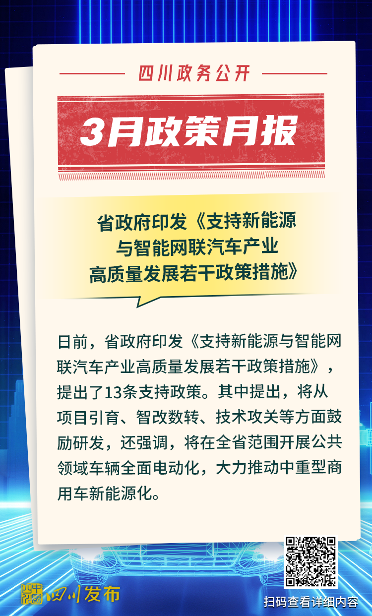四川省人民政府3月出台了多项重要政策。其中,涉及支持新能源与智能网联汽车产业高质量发展若干政策措施、立法计划、自然资源督察办法、征地工作等重要方面。