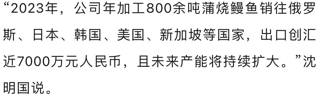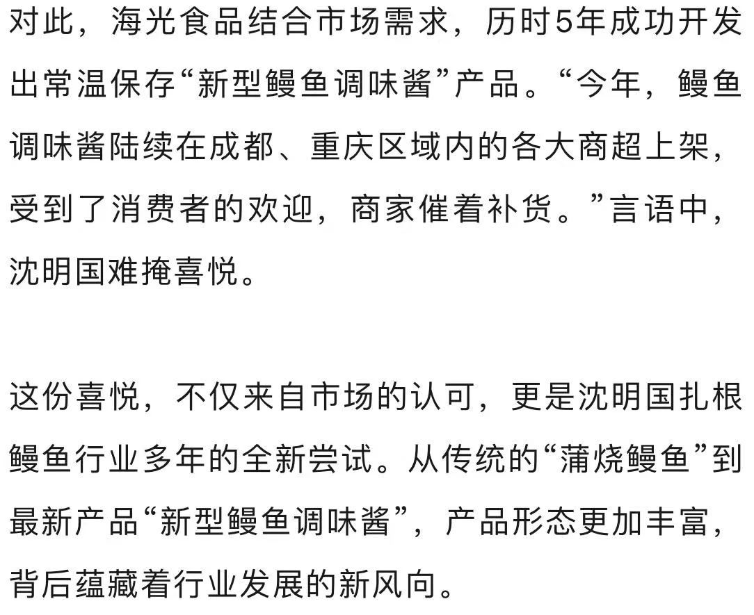 “必须要严格把控鳗鱼产品品质,所有拉过来的活鳗都要在第一时间加工成烤鳗,放进冻库,保证口感。”在大邑县王泗镇,刚以“川鳗第一人”入选“天府兴农榜”的成都市海光食品有限公司董事长兼总经理沈明国已经回到公司忙碌起来。