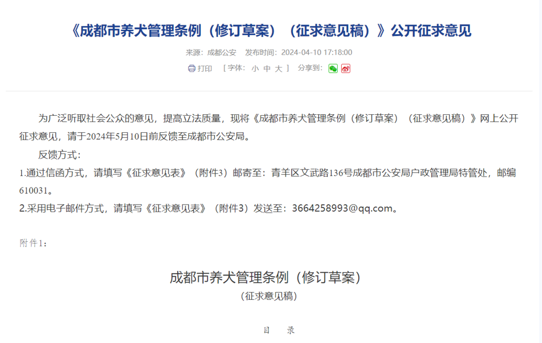 目前,该草案正在网上公开征求意见,在2024年5月10日前反馈至成都市公安局。通过信函方式,请填写《征求意见表》邮寄至:青羊区文武路136号成都市公安局户政管理局特管处,邮编610031。采用电子邮件方式,请填写《征求意见表》发送至:3664258993@qq.com。