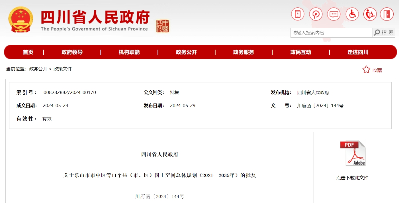 四川发布客户端消息 记者今日从四川省人民政府网站获悉,省政府批复同意《乐山市市中区国土空间总体规划(2021—2035年)》《乐山市沙湾区国土空间总体规划(2021—2035年)》《乐山市五通桥区国土空间总体规划(2021—2035年)》《乐山市金口河区国土空间总体规划(2021—2035年)》《犍为县国土空间总体规划(2021—2035年)》《井研县国土空间总体规划(2021—2035年)》《夹江县国土空间总体规划(2021—2035年)》《沐川县国土空间总体规划(2021—2035年)》《峨边彝族自治县国土空间总体规划(2021—2035年)》《马边彝族自治县国土空间总体规划(2021—2035年)》《峨眉山市国土空间总体规划(2021—2035年)》(以下简称《规划》)。