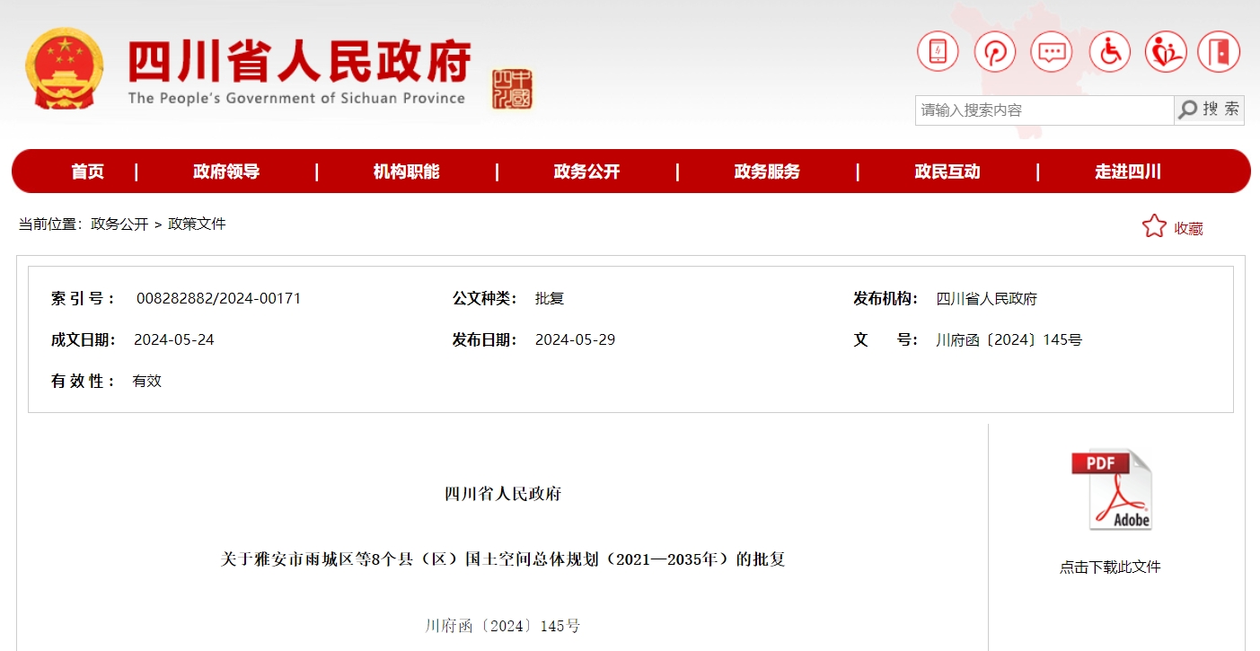 四川发布客户端消息 记者今日从四川省人民政府网站获悉,省政府批复同意《雅安市雨城区国土空间总体规划(2021—2035年)》《雅安市名山区国土空间总体规划(2021—2035年)》《荥经县国土空间总体规划(2021—2035年)》《汉源县国土空间总体规划(2021—2035年)》《石棉县国土空间总体规划(2021—2035年)》《天全县国土空间总体规划(2021—2035年)》《芦山县国土空间总体规划(2021—2035年)》《宝兴县国土空间总体规划(2021—2035年)》(以下简称《规划》)。