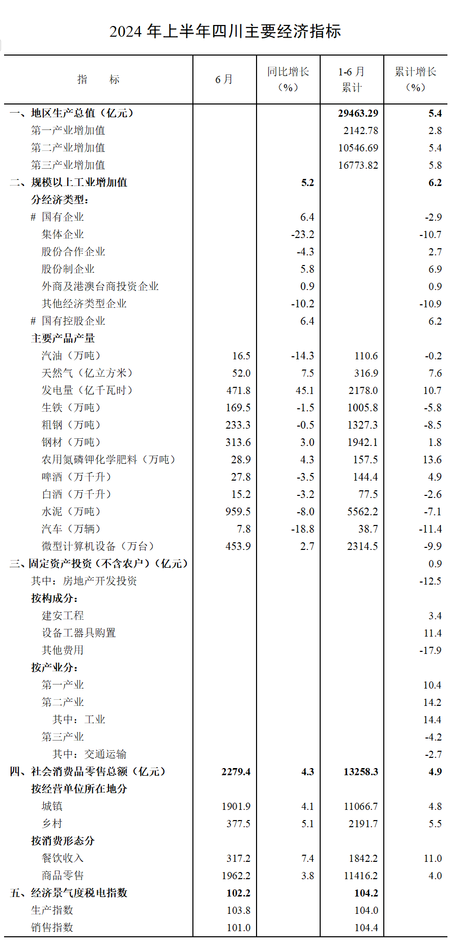 根据地区生产总值统一核算结果,上半年四川地区生产总值为29463.3亿元,按不变价格计算,同比增长5.4%。其中,第一产业增加值为2142.8亿元,增长2.8%;第二产业增加值为10546.7亿元,增长5.4%;第三产业增加值为16773.8亿元,增长5.8%。