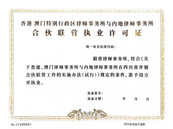 据悉,《香港澳门特别行政区律师事务所与内地律师事务所合伙联营执业许可证》《合伙联营律师事务所港澳律师工作证》由四川省司法厅统一制发。社会公众可以登录四川省司法厅门户网站查询证件样式信息。