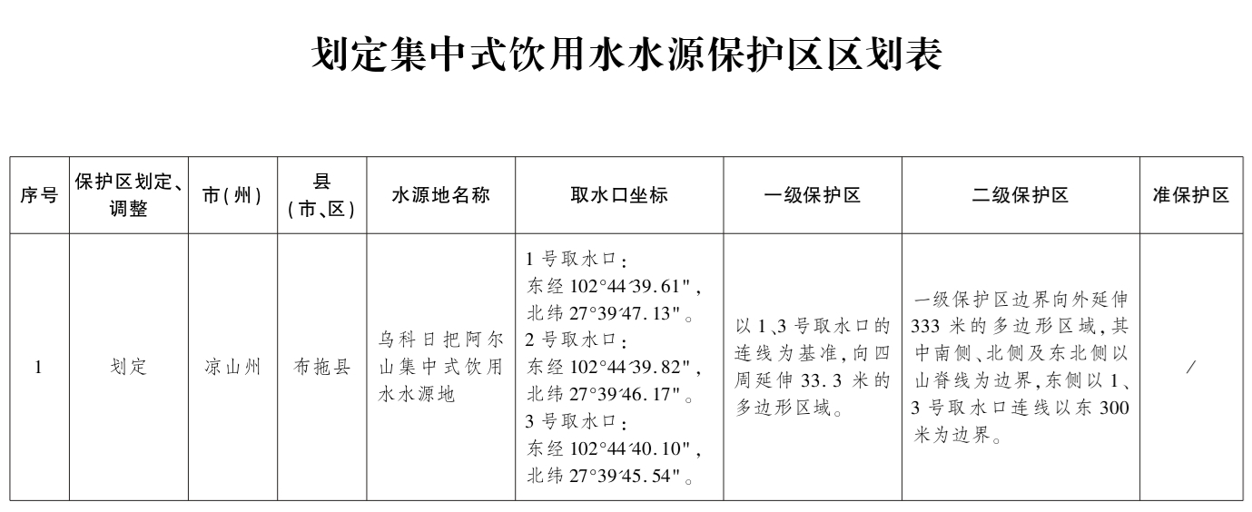 批复要求,本次划定集中式饮用水水源保护区的凉山州政府、布拖县政府要严格按照相关法律法规和政策标准,处理好饮用水水源保护与永久基本农田“非粮化”、矿权许可的关系,落实好各项工程措施和生态环境保护措施,切实加强饮用水水源保护区规范化建设和监督管理,有效防治饮用水水源地污染。同时,制定完善饮用水水源地突发环境事件应急预案,确保饮用水水源安全。