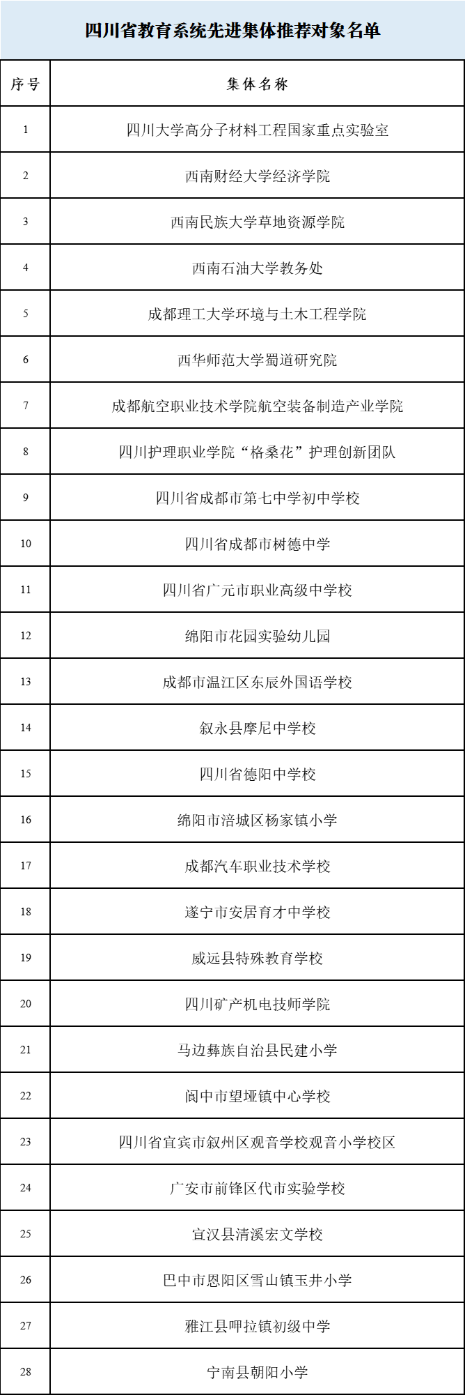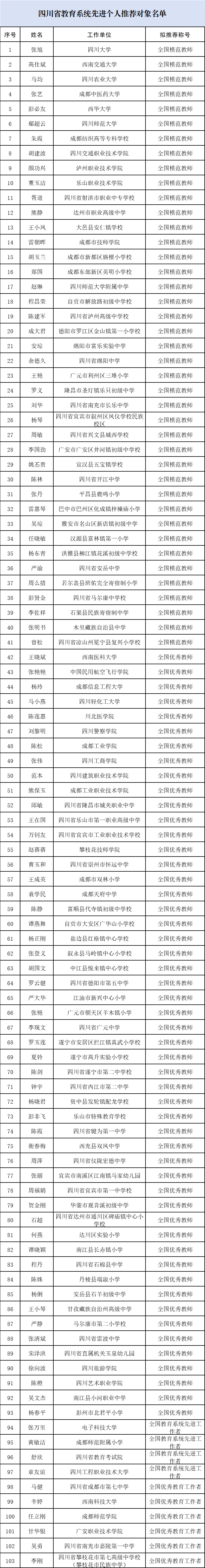 四川发布客户端消息 日前,四川省教育厅发布了《关于全国教育系统先进集体和先进个人推荐对象的公示》,确定四川大学高分子材料工程国家重点实验室等28个集体为“全国教育系统先进集体”推荐对象,张旭等41名同志为“全国模范教师”推荐对象,王晓斌等52名同志为“全国优秀教师”推荐对象,张万里等4名同志为“全国教育系统先进工作者”推荐对象,马健等6名同志为“全国优秀教育工作者”推荐对象。