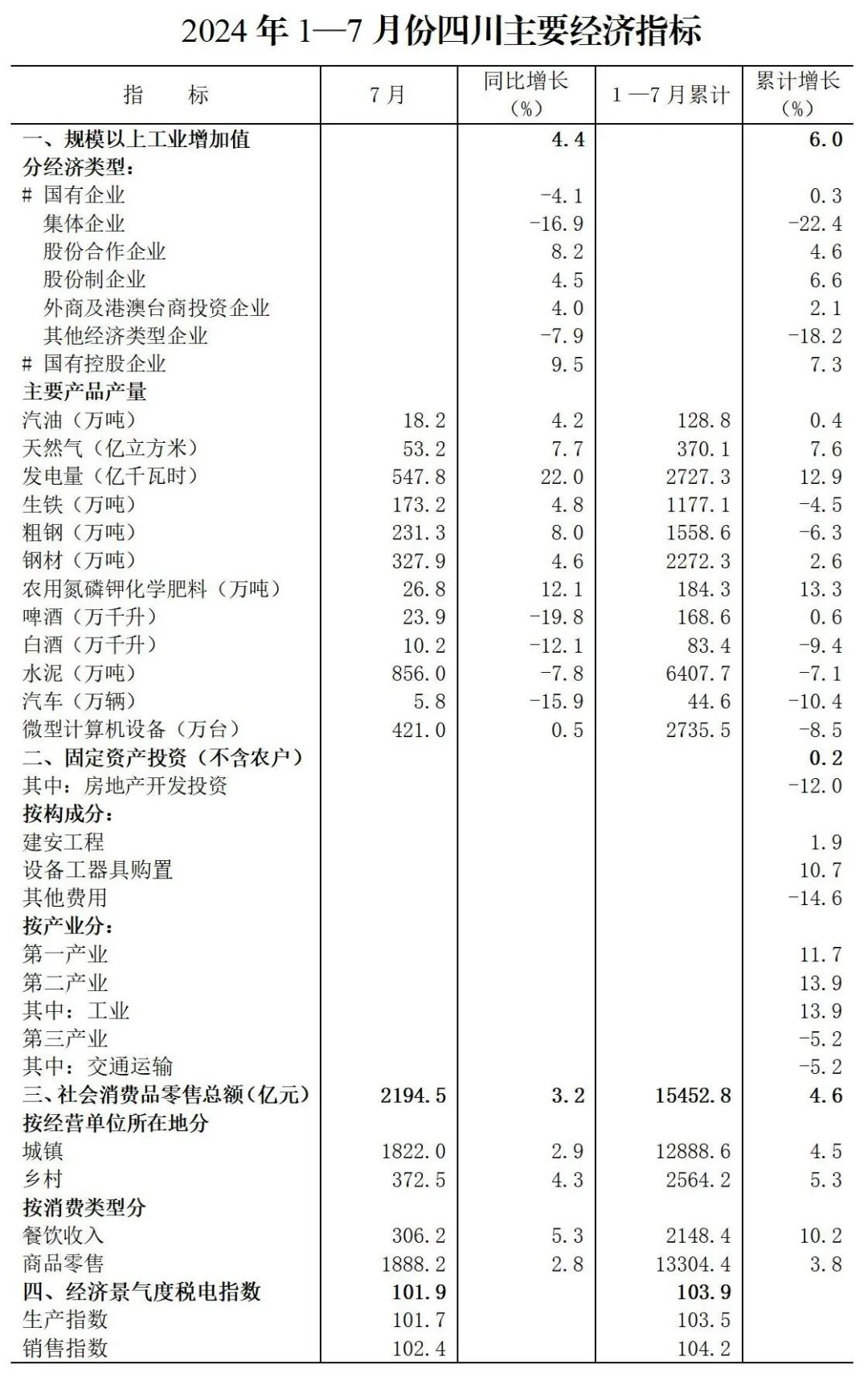 四川发布客户端消息 据四川统计消息,2024年1—7月四川省国民经济主要指标数据出炉。详情如下: