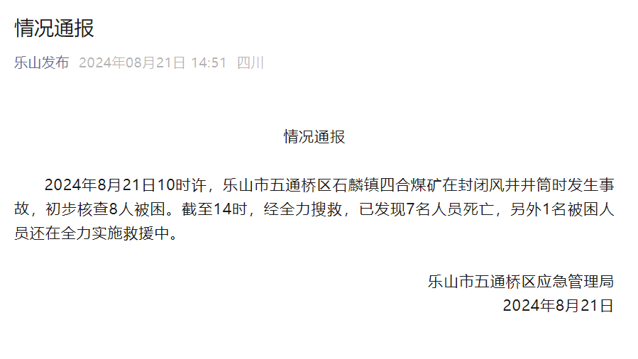 2024年8月21日10时许,乐山市五通桥区石麟镇四合煤矿在封闭风井井筒时发生事故,初步核查8人被困。截至14时,经全力搜救,已发现7名人员死亡,另外1名被困人员还在全力实施救援中。