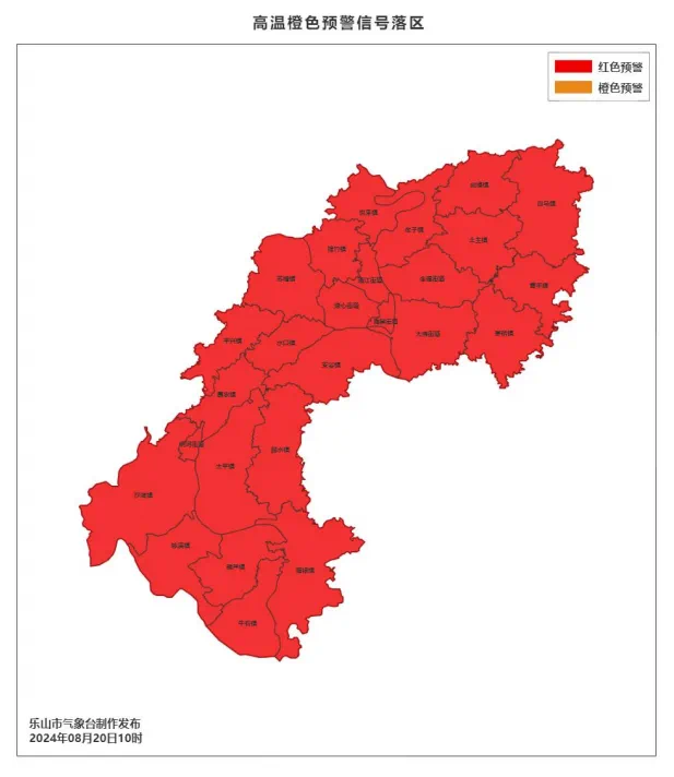 乐山市气象台2024年08月23日10时06分继续发布高温红色预警信号:预计未来24小时,沙湾区踏水镇、葫芦镇、轸溪镇、牛石镇、福禄镇、太平镇、嘉农镇、沙湾镇、铜河街道,市中区海棠街道、通江街道、平兴镇、剑峰镇、牟子镇、悦来镇、大佛街道、全福街道、棉竹镇、安谷镇、水口镇、苏稽镇、青平镇、茅桥镇、白马镇、土主镇、绿心街道等乡镇(街道)日最高气温将升至37℃以上。请注意防暑降温。