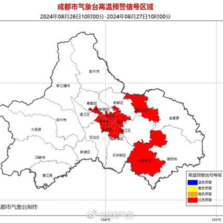 成都市气象台2024年8月26日10时00分继续发布高温红色预警信号:预计成都市武侯区、锦江区、青羊区、成华区、金牛区、高新南区、高新西区和青白江区的所有镇(街道)未来24小时内最高气温将升至37℃以上,东部新区的所有镇(街道)未来24小时内最高气温将升至40℃以上。高温时段主要出现在今日11时至19时。请注意防范。