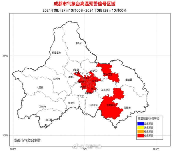 四川发布客户端消息 今日,从成都市气象台获悉,成都市气象台2024年08月27日10时00分继续发布高温红色预警信号:预计成都市武侯区、锦江区、青羊区、成华区、金牛区、高新南区、高新西区和青白江区的所有镇(街道)未来24小时内最高气温将升至37℃以上,东部新区的所有镇(街道)未来24小时内最高气温将升至40℃以上。高温时段主要出现在今日11时至19时。请注意防范。