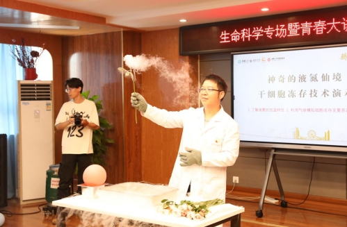 演示后,现场邀请15位同学上台体验,在老师的带领下操作实验。通过实验同学们不仅欣赏到了液氮带来的视觉奇观,还直观地了解到液氮冻存技术在干细胞研究和治疗中的应用,增加了对生物医学科学原理的认识和兴趣。现场,王博士还向同学们介绍了“依托中国空间站和神舟十三号,我国科研工作者完成了国际上首次皮肤干细胞长期失重条件下的悬浮培养实验”这一重大成就,展现中国在生命科学领域的卓越进展。