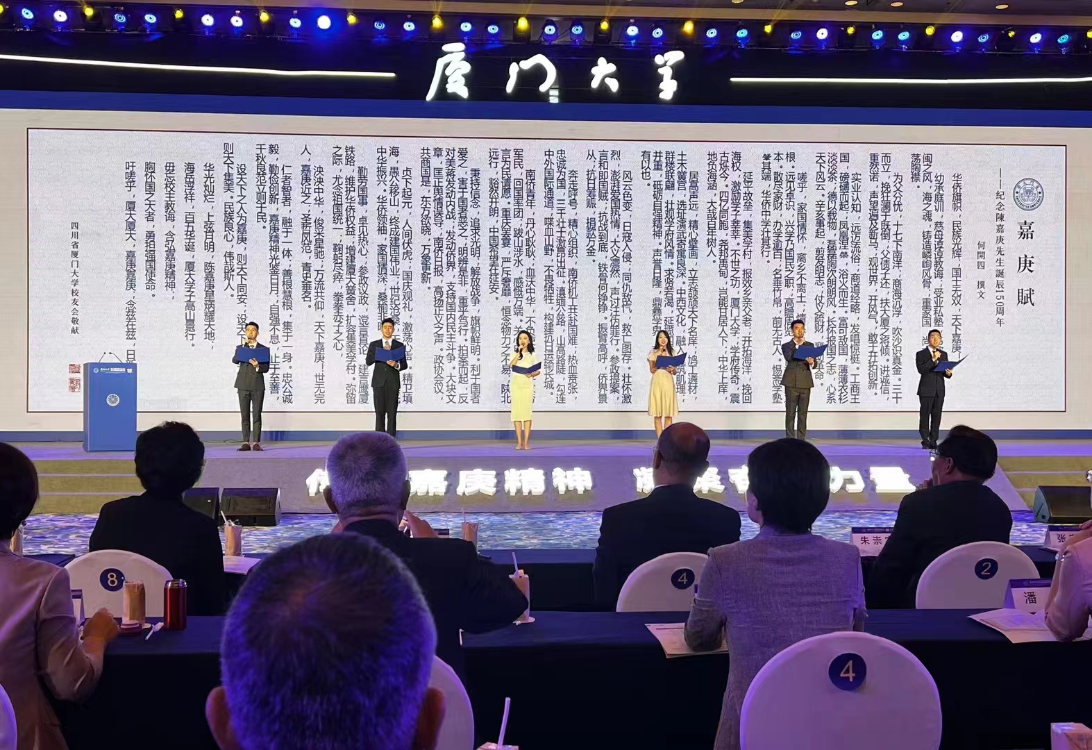华光灿烂,上弦月明,陈嘉庚星炳耀天地;海岳浮祥,百五华诞,厦大学子高山景行。毋忘校主教诲,含弘嘉庚精神;胸怀国之大者,勇担强国使命。吁嗟乎,厦大厦大,嘉庚嘉庚;念兹在兹,日新月新!