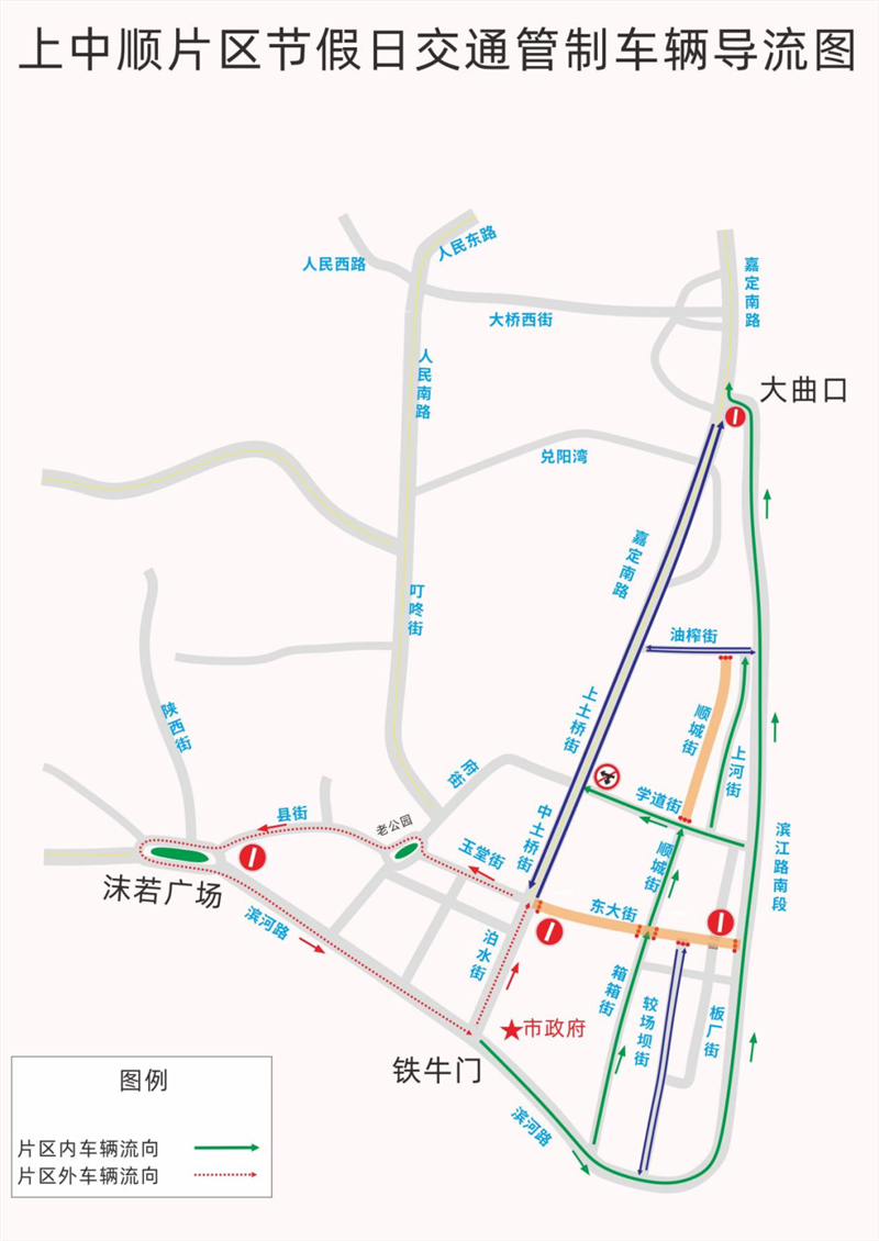 2、滨河路、滨江路南段(市政府至大曲口段)实行单向通行,进入上中顺片区的车辆由滨河路铁牛门路口驶入,沿滨河路、滨江路南段往大曲口方向单向通行驶出,禁止车辆从大曲口方向往市政府方向行驶。