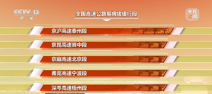 从高速公路车流量来看,全国高速公路易拥堵缓行主要有: