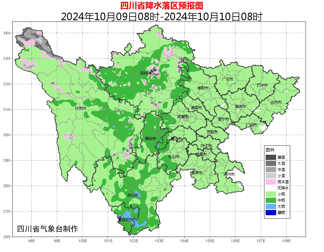 四川气象台预计:今日起三天,盆地大部阴天间多云有阵雨或小雨;川西高原和攀西地区多阵雨(雪),雨量小到中雨,其中攀西地区南部局部有大雨到暴雨,需防范局地强降水带来的气象次生灾害。