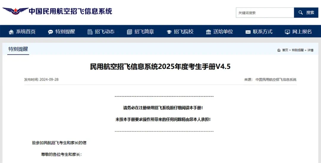 民航招飞指普通高校飞行技术专业(本科)通过高考招收飞行技术专业的学生。近日,中国民用航空招飞信息系统发布《民用航空招飞信息系统2025年度考生手册》,明确2025年民航招飞报名时间、招生院校等重要信息,有意愿报名的同学千万别错过。