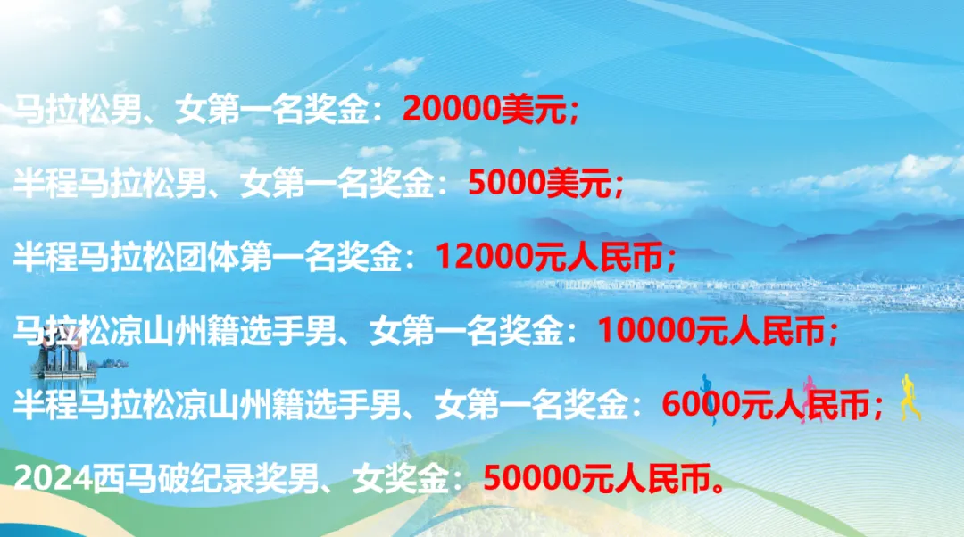 在名次奖与团体赛名次奖之外,西马今年继续保持马拉松凉山州籍选手奖,名次录取男、女选手分别增加至100名,第一名奖金各10000元人民币;半程马拉松凉山州籍选手奖,分别录取男、女选手前50名,第一名奖金各6000元人民币。另设破纪录奖,凡破西昌邛海湿地马拉松赛马拉松项目男、女子赛会记录者,奖励50000元人民币。