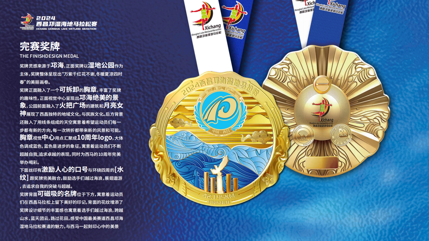 今年完赛奖牌设计灵感来源于邛海,融合了邛海湿地、火把广场、月亮女神三大元素。“正面有10周年可拆卸胸章,背面有可磁吸的名牌。奖牌整体呈现出‘万紫千红花不谢,冬暖夏凉四时春’的美丽画卷。”