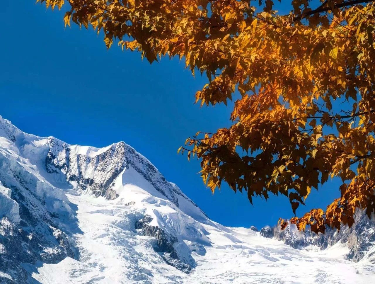 随着海拔降低,海螺沟半山腰的原始森林也换上了秋日的盛装,五彩斑斓的秋叶与远处巍峨的雪山交相辉映。游客漫步山林间,感受着秋意与冬韵的和谐共鸣。