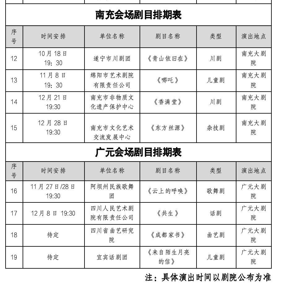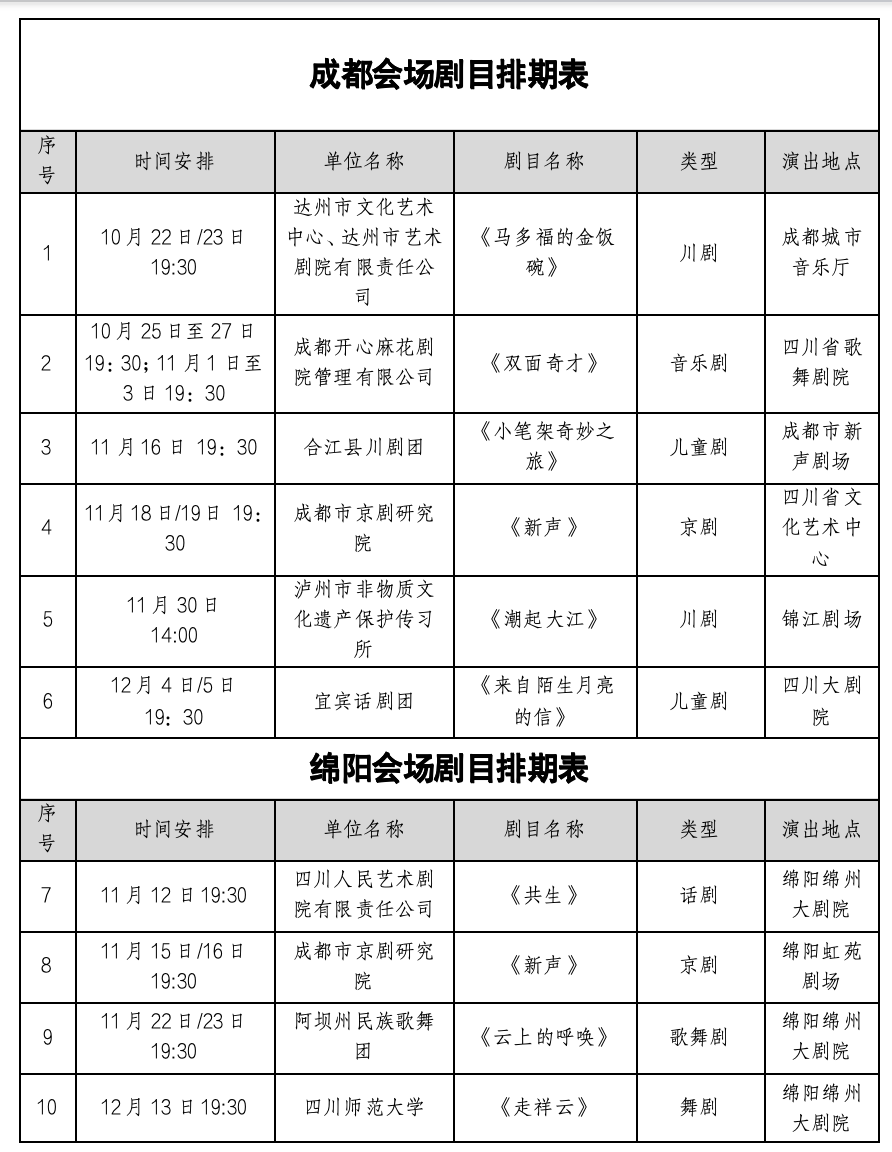 本次汇演设一个主会场(成都市)和三个分会场(绵阳市、南充市、广元市),共演出30场15部获国家艺术基金、四川艺术基金资助的优质精品剧目。演出地点包括四川省文化艺术中心、四川大剧院、四川省歌舞剧院、成都城市音乐厅、成都市新声剧场、锦江剧场、绵阳绵州大剧院、绵阳虹苑剧场、南充大剧院、广元大剧院等。