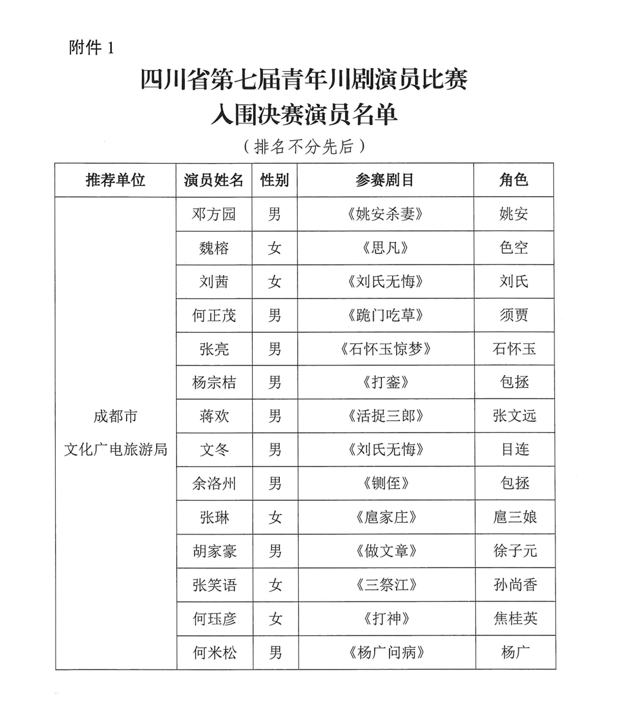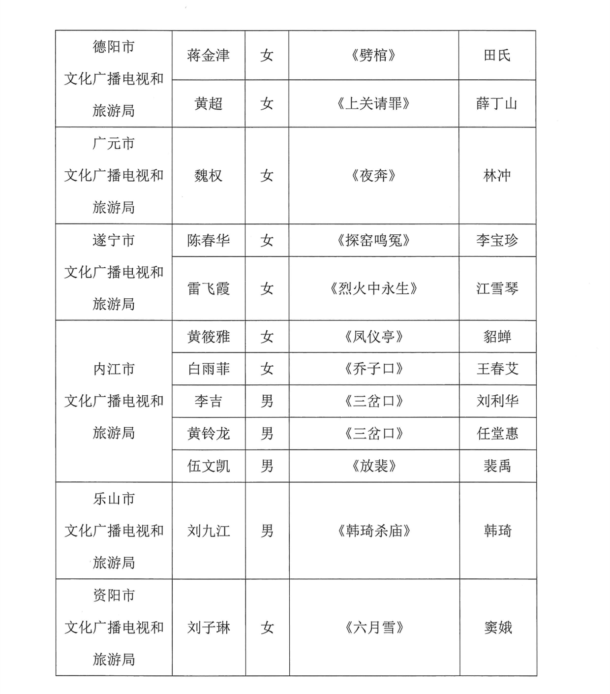 四川发布客户端消息 记者从四川省文化和旅游厅网站获悉,四川省第七届青年川剧演员比赛决赛定于今年11月1日至5日在德阳市举行。入围决赛演员名单如下: