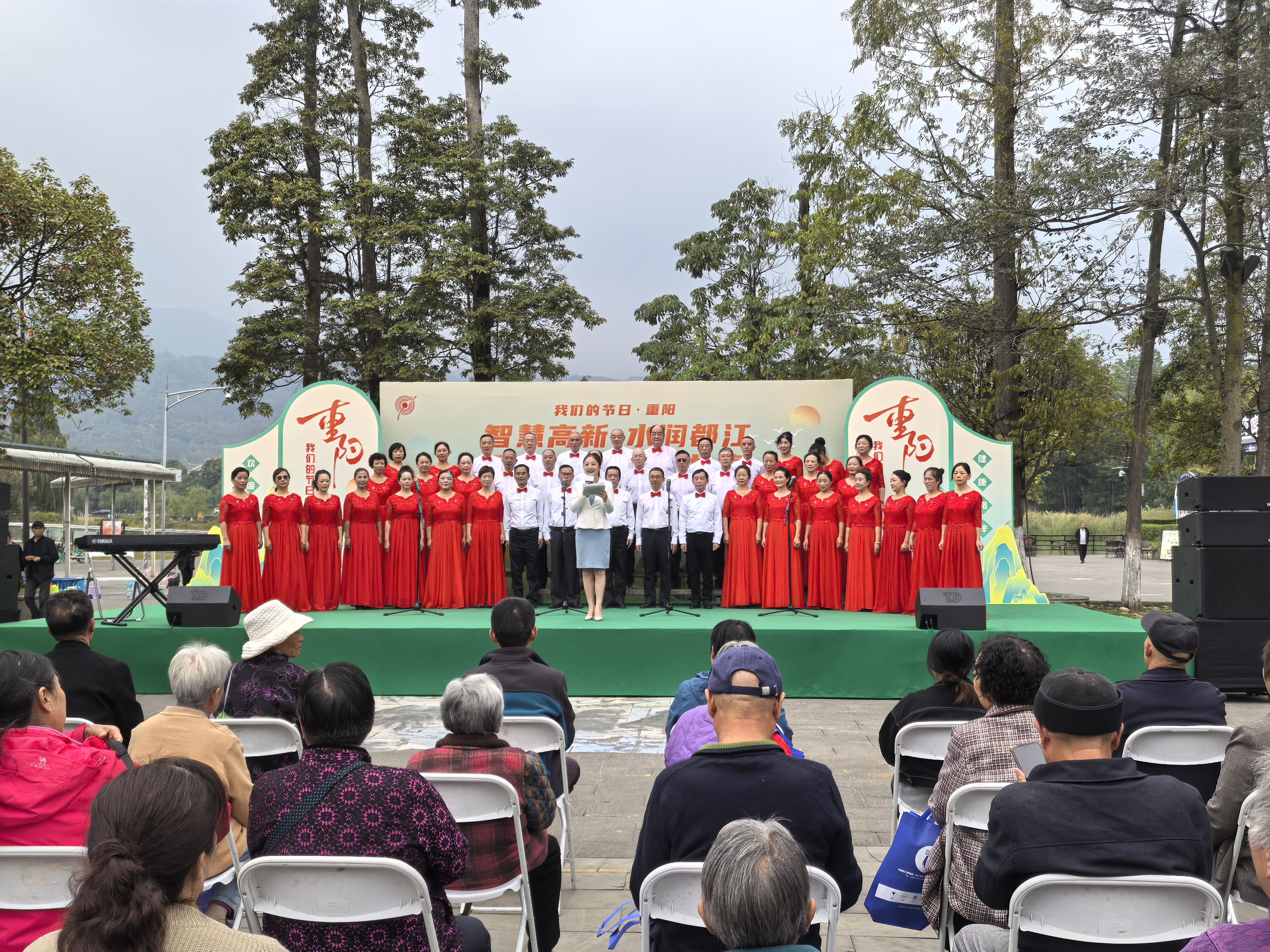 一老一小都是家中宝。在“童心敬老,爱满重阳”儿童诗朗诵节目和“活力无限 魅力无边”老年舞蹈表演中,都江堰市永丰小学的《时光机里的菊花香》颂出对爷爷奶奶的敬爱之情;最美不过夕阳红,温馨又从容……都江堰市音乐家合唱团的大合唱《红旗颂》则唱出爷爷奶奶们积极向上的人生态度。