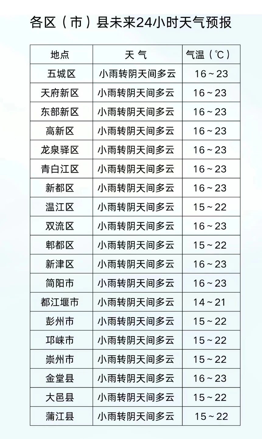 根据气象信息,预计未来三天成都市多云间阴,早晚多小雨或分散小雨,今天晚上到明天白天成都市小雨转阴天间多云。
