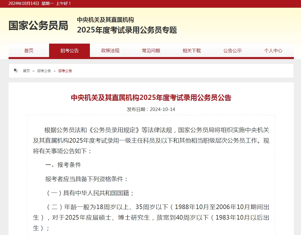 国家公务员局发布消息:中央机关及其直属机构2025年度考试录用公务员报名即将开始,共计划招录3.97万人。考生可于10月15日8:00至10月24日18:00期间登录“中央机关及其直属机构2025年度考试录用公务员专题网站”进行网上报名,公共科目笔试将于12月1日在全国各直辖市、省会城市、自治区首府和部分城市同时举行。