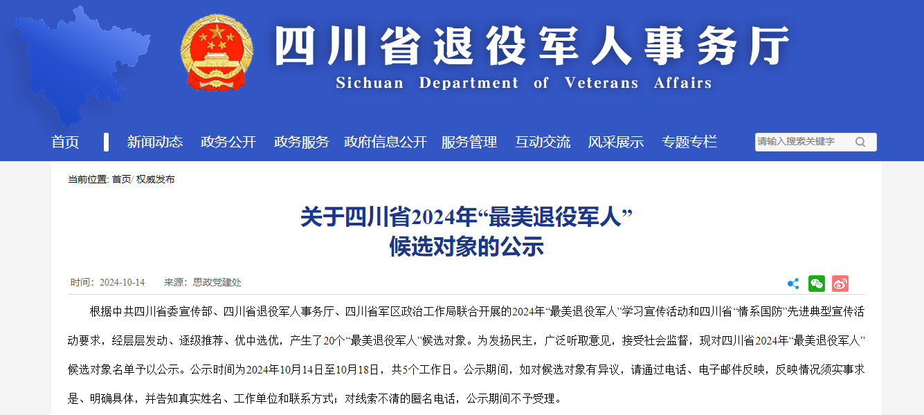 四川发布客户端消息 记者从四川省退役军人事务厅网站获悉,10月14日,四川省2024年“最美退役军人”评审小组公示四川省2024年“最美退役军人”候选对象,共20名。公示时间为2024年10月14日至10月18日,共5个工作日。