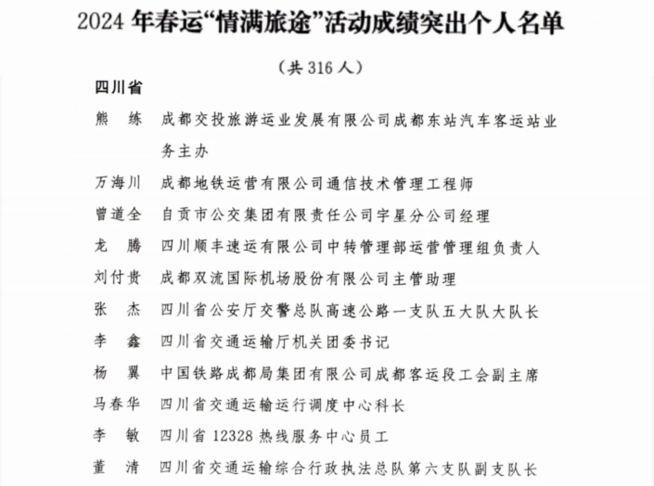 2024年春运期间,全国各级交通运输(含铁路、民航、邮政)、公安、应急管理部门和工会、共青团组织,认真贯彻落实《交通运输部 公安部 应急管理部 中华全国总工会 共青团中央关于深入开展春运“情满旅途”活动的通知》(交运明电〔2024〕11号)要求,加强协同配合,完善服务举措,强化安全监管,优化运输组织,圆满完成了春运服务保障任务。为大力弘扬爱岗敬业和无私奉献精神,交通运输部、公安部、应急管理部、中华全国总工会、共青团中央决定,对北京公联客运站经营有限公司四惠长途客运站等242个成绩突出的集体和李国庆等316名成绩突出的个人予以通报表扬。