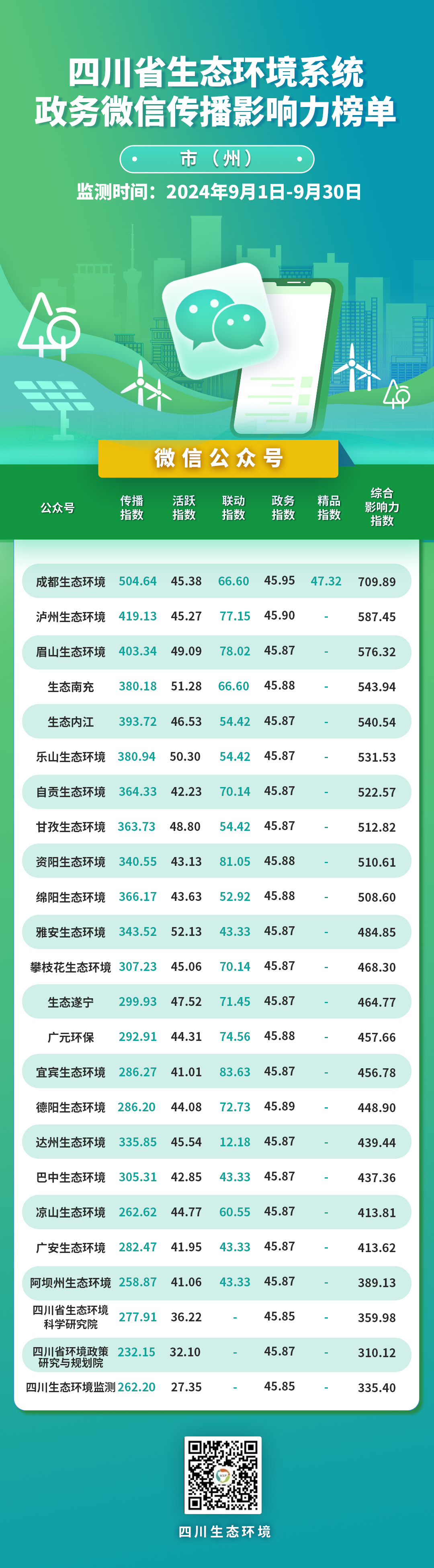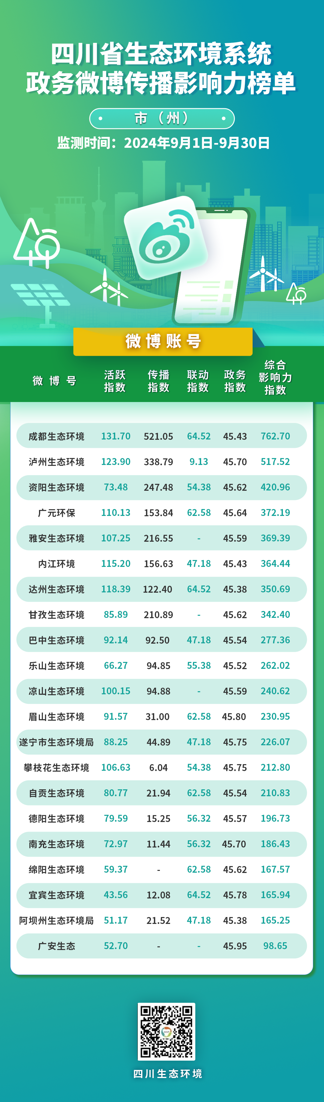 9月,@成都生态环境综合影响力指数位居首位,@泸州生态环境第二,@资阳生态环境第三。