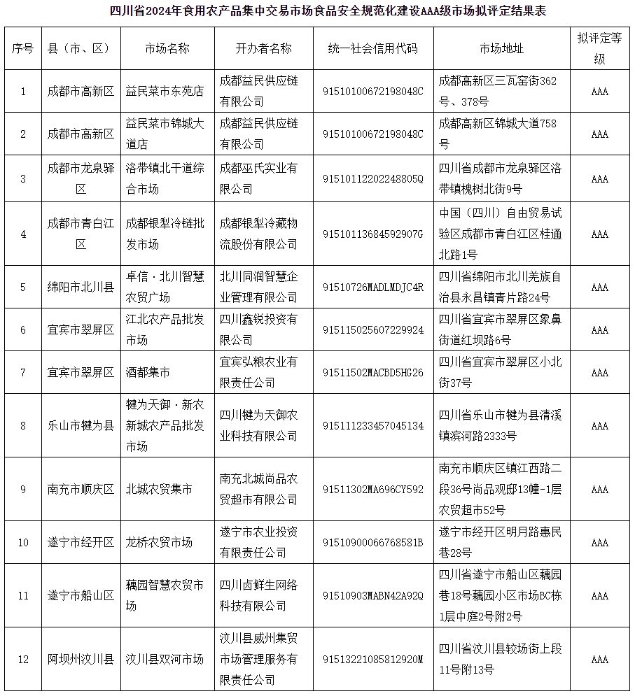 记者从四川省市场监督管理局网站获悉,10月29日,四川省食品安全委员会办公室公示食用农产品集中交易市场食品安全规范化建设AAA级市场拟评定结果。具体如下: