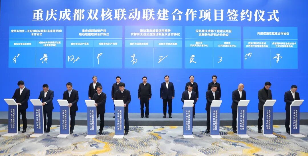 曹立军代表成都市委、市政府向重庆长期以来对成都经济社会发展的关心支持表示感谢。曹立军说,习近平总书记对推动成渝地区双城经济圈建设高度重视,多次作出重要指示批示,为我们推动双城经济圈建设提供了方向指引和根本遵循。4年多来,按照总书记擘画的双城经济圈战略蓝图,在川渝合作机制框架下,重庆成都相向而行、同向发力,合作领域不断拓展,交通通达能力迈上新台阶,产业统筹联动取得新进展,科技融合创新跑出加速度,政策协同互促取得新突破,双核联动联建实现了从快速起步到全面成势的阶段性跨越,“五个共建”“五个互联互通”已成为成渝协同、区域共兴的核心抓手,为重庆成都推动高质量发展注入了强劲动力。明年是成渝地区双城经济圈建设5周年。站位新阶段,需要我们共同加力加劲、乘势而上,推动成渝双核更好支撑打造带动西部高质量发展的重要增长极和新的动力源。希望双方更加注重外畅内联、开放共享,在共建国际性综合交通枢纽上聚力突破;更加注重产业协作、优化提质,在共建世界级先进制造业集群上聚力突破;更加注重科技赋能、协同转化,在共建西部科学城上聚力突破;更加注重资源聚集、服务提质,在共建西部金融中心上聚力突破;更加注重市民需求、可感可及,在共建现代化国际都市上聚力突破;更加注重机制完善、高效运转,不断凝聚双核联动联建工作合力。