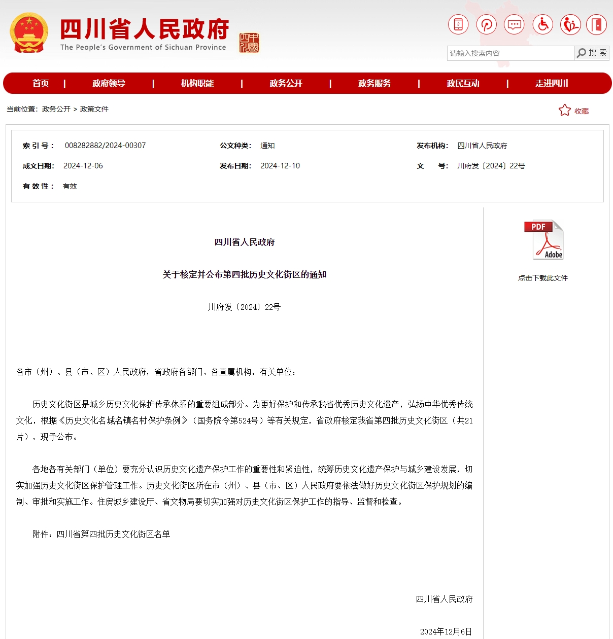 四川发布客户端消息 历史文化街区是城乡历史文化保护传承体系的重要组成部分。为更好保护和传承我省优秀历史文化遗产,弘扬中华优秀传统文化,记者从省政府网获悉,今日,省政府核定并公布第四批历史文化街区,共21个。